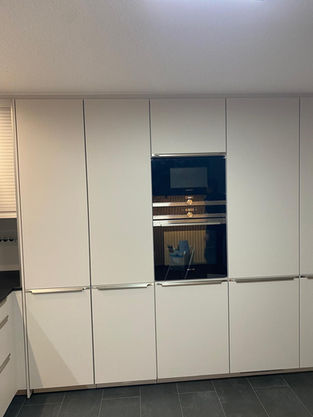 Die klaren, matten Schrankfronten in Kombination mit der dunklen, strukturierten Arbeitsplatte schaffen einen eleganten Kontrast, der sowohl Stil als auch Praktikabilität unterstreicht.